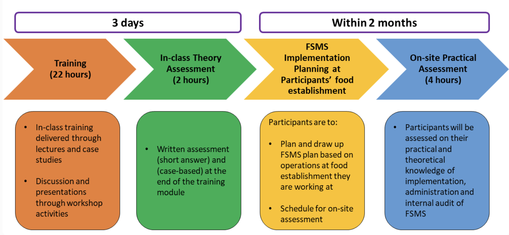 Additionally, participants will undergo a 4-hour on-site practical assessment on FSMS implementation. This ensures that FSMS plans developed by the participants graduating from the course meet SFA’s requirements.